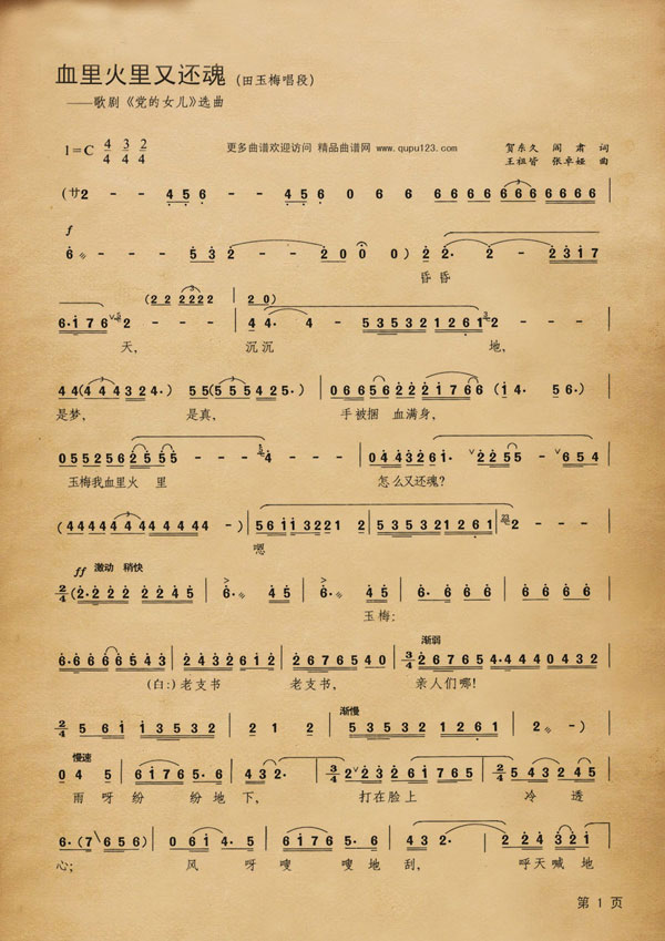 血里火里又还魂(歌剧《党的女儿》-田玉梅唱段)曲谱