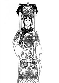 满族人因隶旗籍,所以称为旗人。旗蟒原是指清朝满族皇后所用的吉服—朝袍。这是保留在京剧传统服装中为数不多的清代服饰原型之一,当然,它也是经过了一定艺术加工的。成为戏曲服装后,它已失去了历史朝代的规定性,而被纳入了程式的轨道—通用于中国古代各少数民族(即所谓“番邦”)统治阶层的贵族妇女。使用时,内衬“领衣儿”,外挂朝珠。