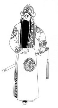 箭蟒是在蟒的基础上,突破原有形制,吸取了箭衣的某些特点后而新创的服式,也是马连良先生所创。保留的是齐肩圆领、大襟、两旁开衩等蟒袍造型;变革的是衣袖的形制,即是以箭衣的窄袖,马蹄袖口,取代了阔袖及水袖。这种剧装是专为《胭脂宝褶》中的永乐皇帝没汁的,以适应这位皇帝在微服出巡的特定环境下的特殊扮相:既有平民武士的风貌,又不失帝王气质。箭蟒用织有隐花纹的绉绸制作,身上绣六个龙团。采自历史人物画“明太祖像“上的明代皇龙袍的制式。